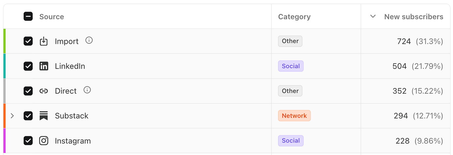 More than half of my subscribers came from Instagram because I was collecting emails through lead magnets before I even started the newsletter. Substack has some discovery built in - you can grow through Notes. I also grow via Linkedin by restructuring every newsletter as LinkedIn posts and link back to Substack for the full read. Your first subscribers could be friends and family. Your most sustainable growth may be through shares and referrals.